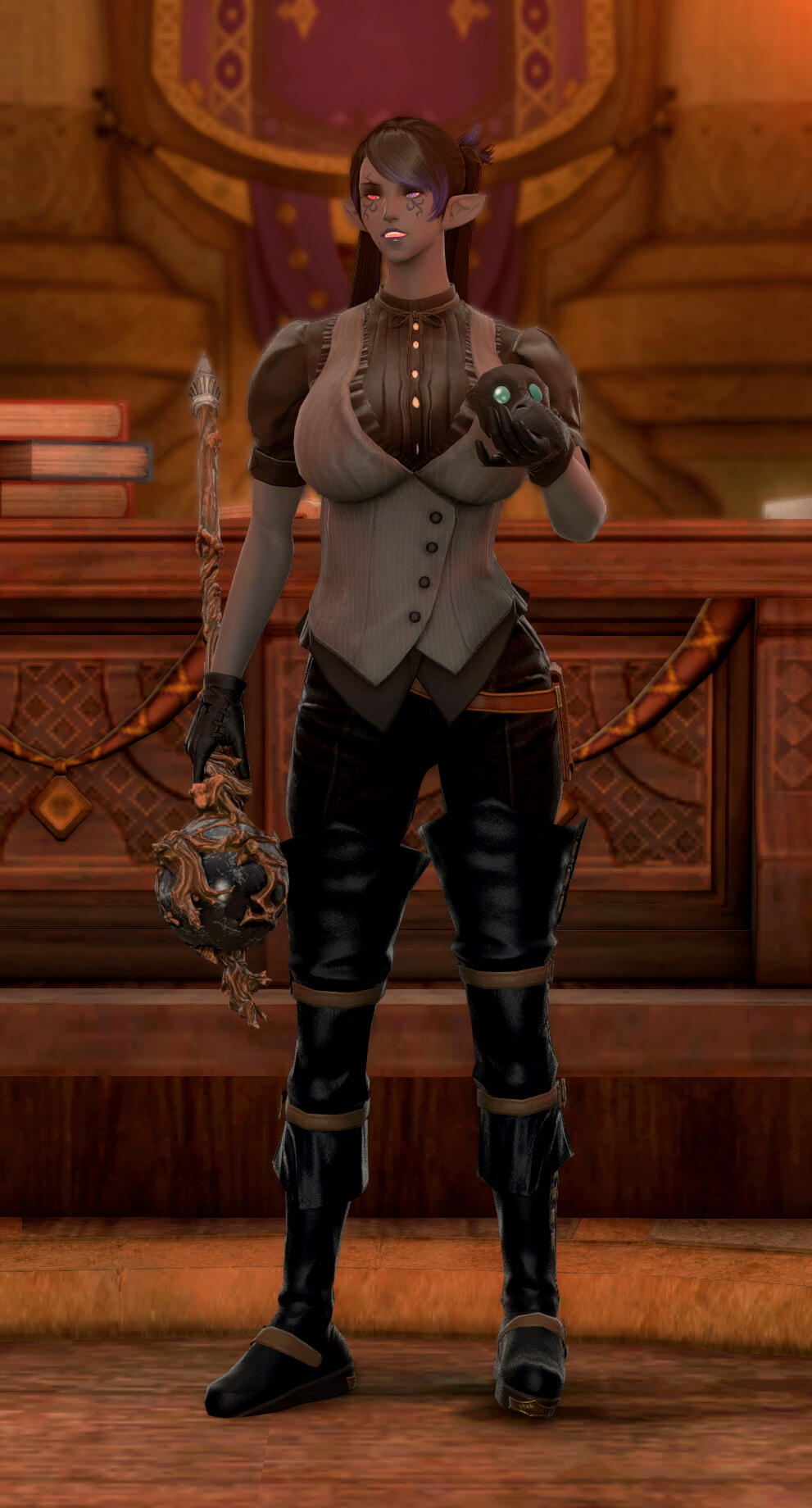 GridaniaA witch from a long line of Duskwights who studied ‘wild’ magic, Reinette was used to being seen as an outcast, but she didn’t allow the suspicions that followed her people to ruin her warm outlook. Instead she thrived under her grandmother’s tutelage, the old crone and her granddaughter offer comfort and easing the pain as best they could to those who had been rejected by the elementals or Gridania as a whole. The care they offered was limited, but was often funerary rights for the dead and poison for the dying.The family developed a working relationship with the migrants of Quarrymill, often supplying them with mead, wild game and their other services. They buried and cremated the dead of the Duskwight bandits and those who refused to join Gridanians in their city due to the bigotry. Soon they began to venture further out into the Shroud, attending to those who ask for them. As Reinette grew so did her gift, and she began to hone her skills in her family’s witchcraft, an aged remnant of what was once the power of the Void Mages of Mhach.As with that growing skill, so did her curiosity of the outside world. Although she did so cautiously, she began to visit the neighboring city state’s lands. It was during an outing to Coerthas, she witnessed a Dragoon downing a dragon and fell to what she presumed was his death. Compassion beat out caution, and she ventured down into the Witch’s drop. There she tended to the young Elezen who had nearly died, pulling him back up to the top and when he was finally able, she helped him hide his armor and spear before taking him to her family in the Shroud.Here both Reinette and Ursulin would bond over mutual interests, and the former Dragoon would adopt Reinette’s family's surname as his own. With the adoption also came the adoption of the family's practices of magic,which he used to hide his former profession. Soon Reinette was taking Ursulin along on her adventures, until the both decided to uproot and bid the Rocane family farewell. They soon found employment within the Thaumaturge Guild, Reinette’s skills proving a boon to the handling of the dead.From the guild they turned to adventuring, until they both came embroiled in the plot of the Garlean Empire to destroy Eorzea. Unable to join her adopted brother in battle, Reinette did what she could to defend Ul’dah when the Guildmaster shut the frightened citizens out of the Thaumaturge guild. It was here that she gained the respect of future guildmasters, who she threw into when it came to tend to the city’s dead.Reinette lingered in Ul’dah, carrying bodies to the Lich Yard, performing cremation and the ilk. She could not shake the feeling that someone was missing and she could not remember who. During one of her trips to Drybone, she stumbled upon a Black Mage who appeared shell shocked. It was like a meteor had struck when the memories came back to her and she realized it was Ursulin.As before, she brought him back to her home and he fell into the goings on of the guild. Like before though, this was not meant to laugh. As the machinations of the Ascians came to light, Ursulin returned to the Warriors of Light and Reinette determined not be left behind again joined the Scions of the Seventh Dawn.
